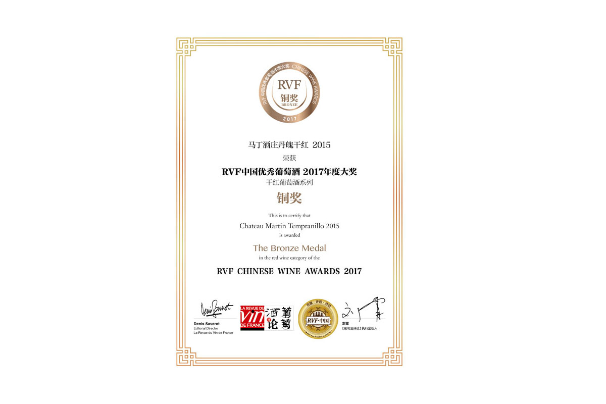 馬丁酒莊丹魄干紅2015 榮獲RVF中國優(yōu)秀葡萄酒2017年度大獎銅獎