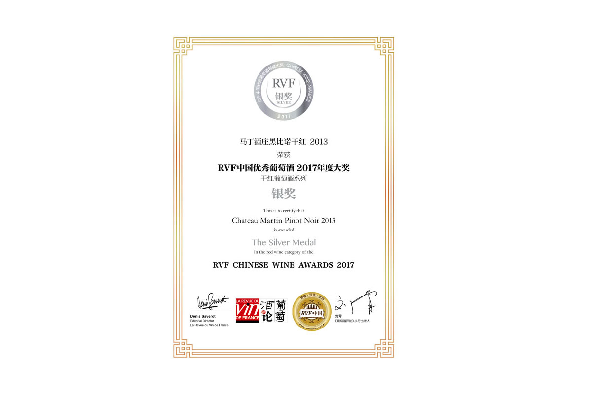 馬丁酒莊黑比諾干紅2013 榮獲RVF中國優(yōu)秀葡萄酒2017年度大獎銀獎