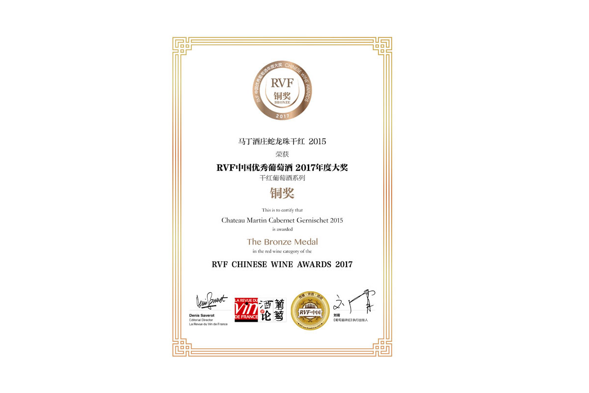 馬丁酒莊蛇龍珠干紅2015 榮獲RVF中國優(yōu)秀葡萄酒2017年度大獎銅獎