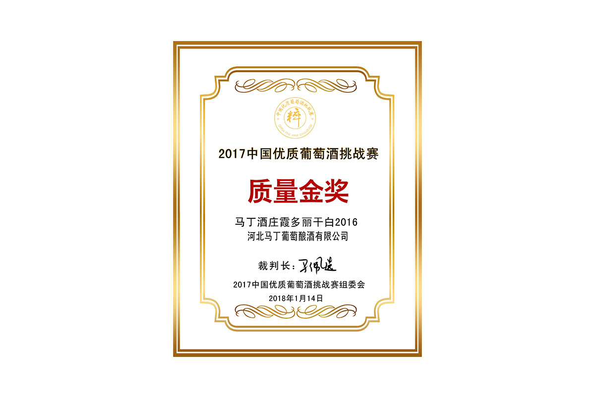 馬丁酒莊霞多麗干白2016 榮獲 2017中國優(yōu)秀葡萄酒挑戰(zhàn)賽 質(zhì)量金獎